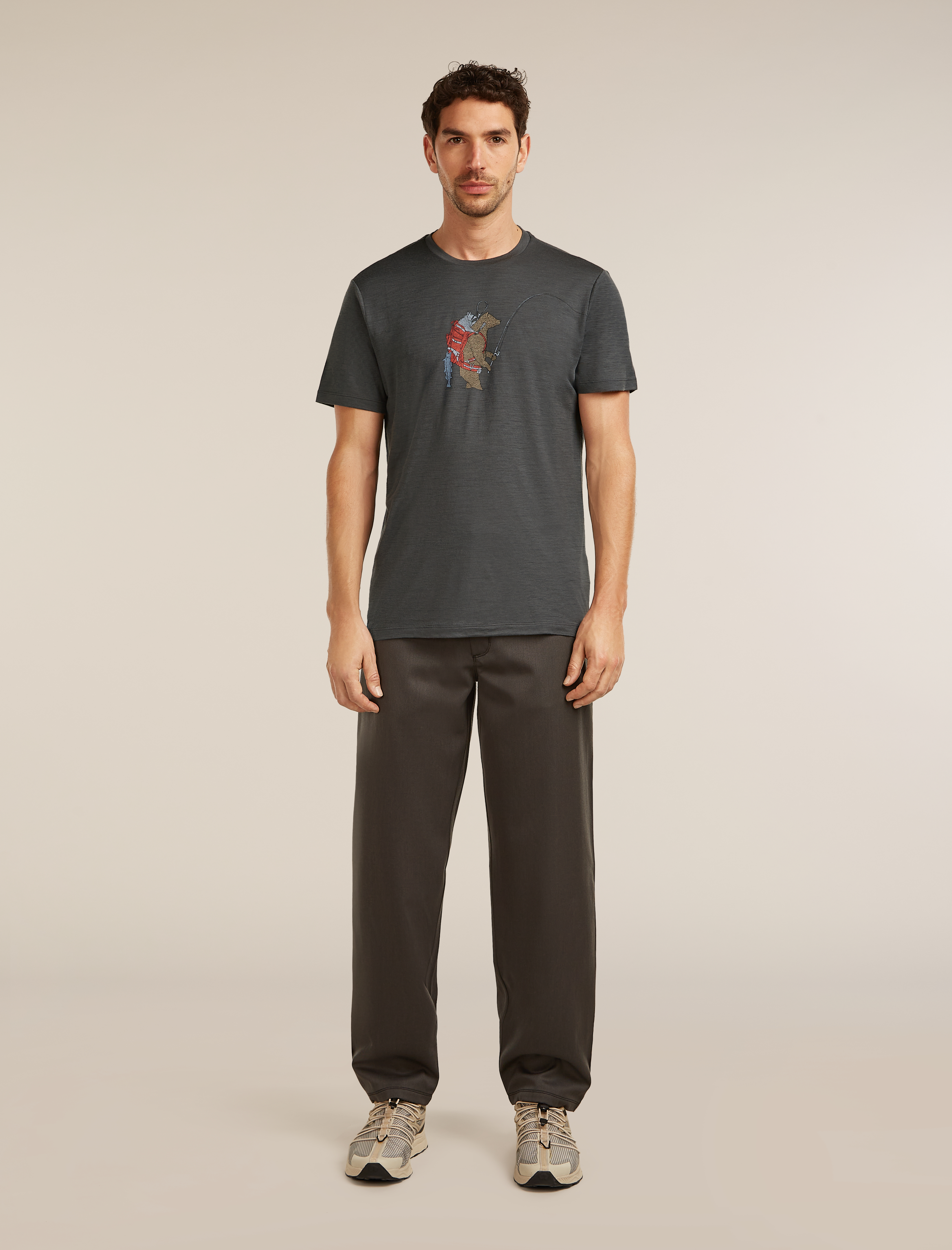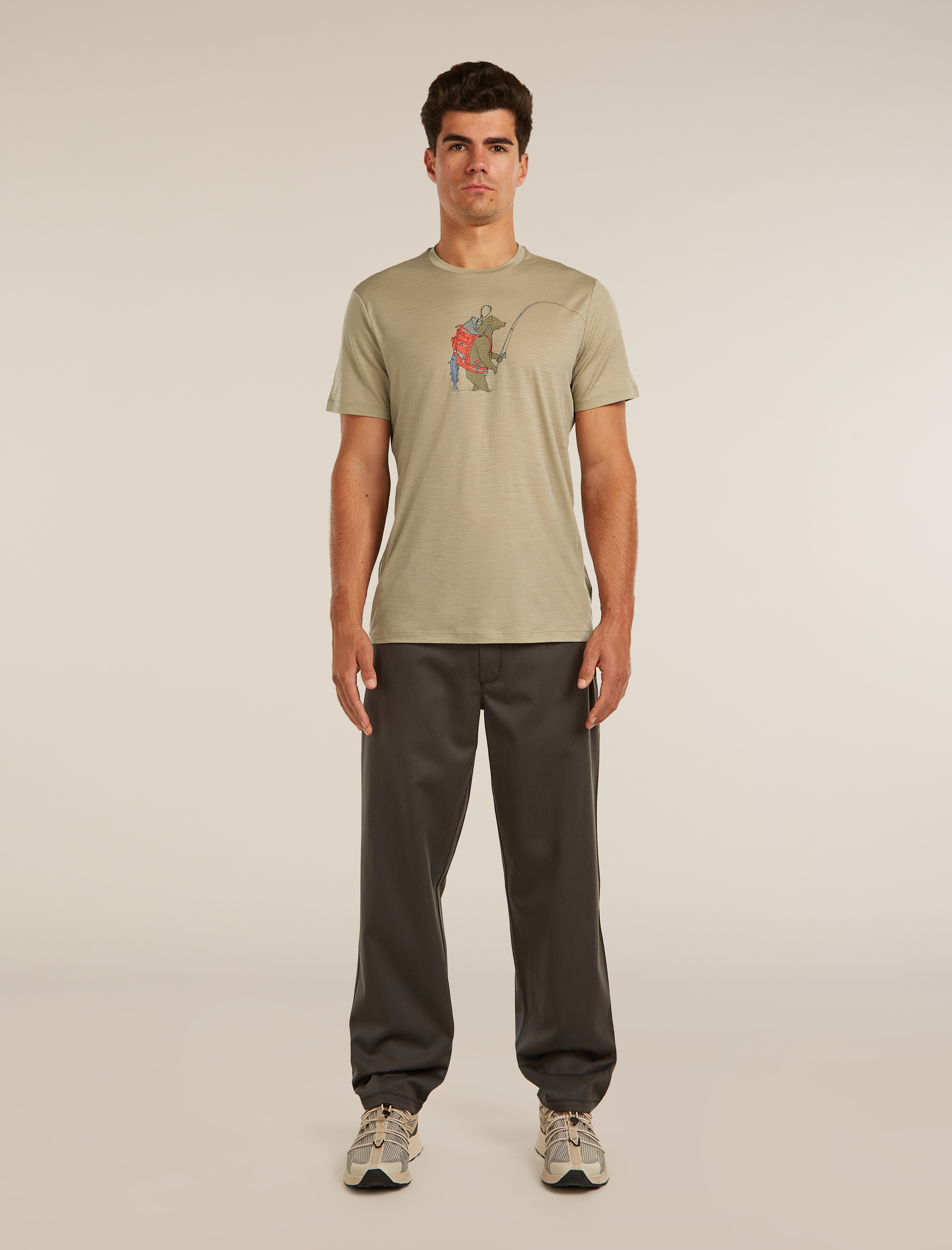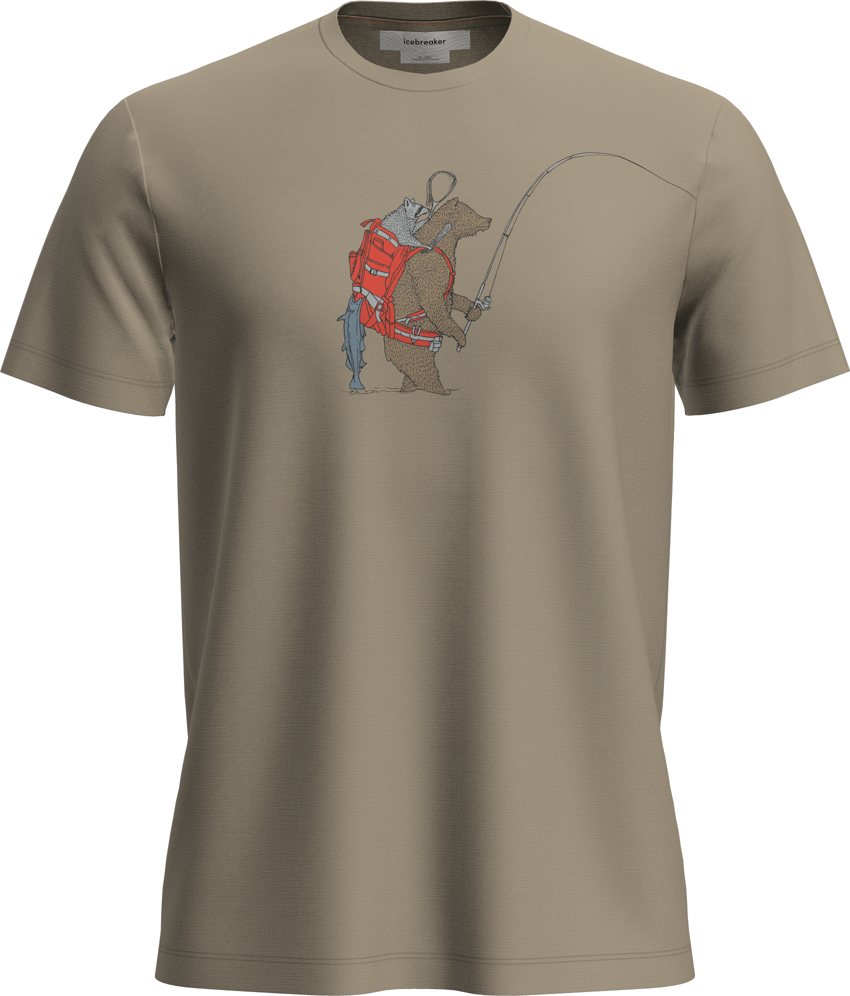 The Bear Catch graphic adds a distinctive visual touch, blending a casual outdoor style with a nature inspired design. Offset shoulder seams help reduce friction and improve comfort during extended wear.