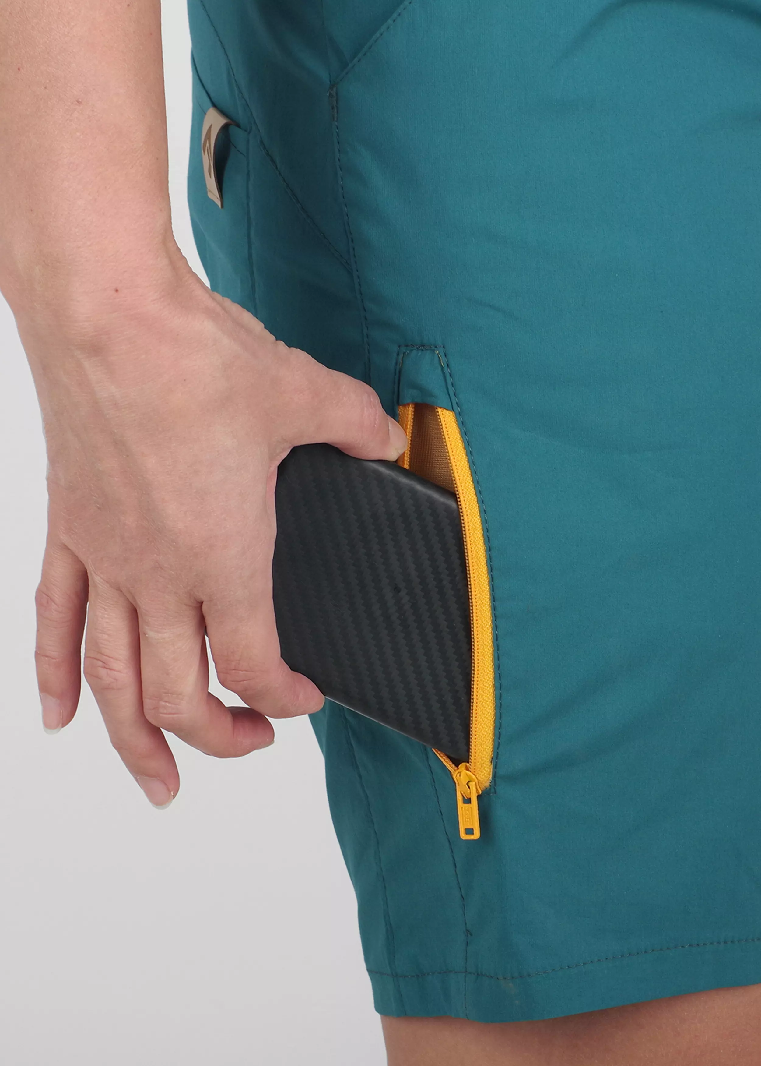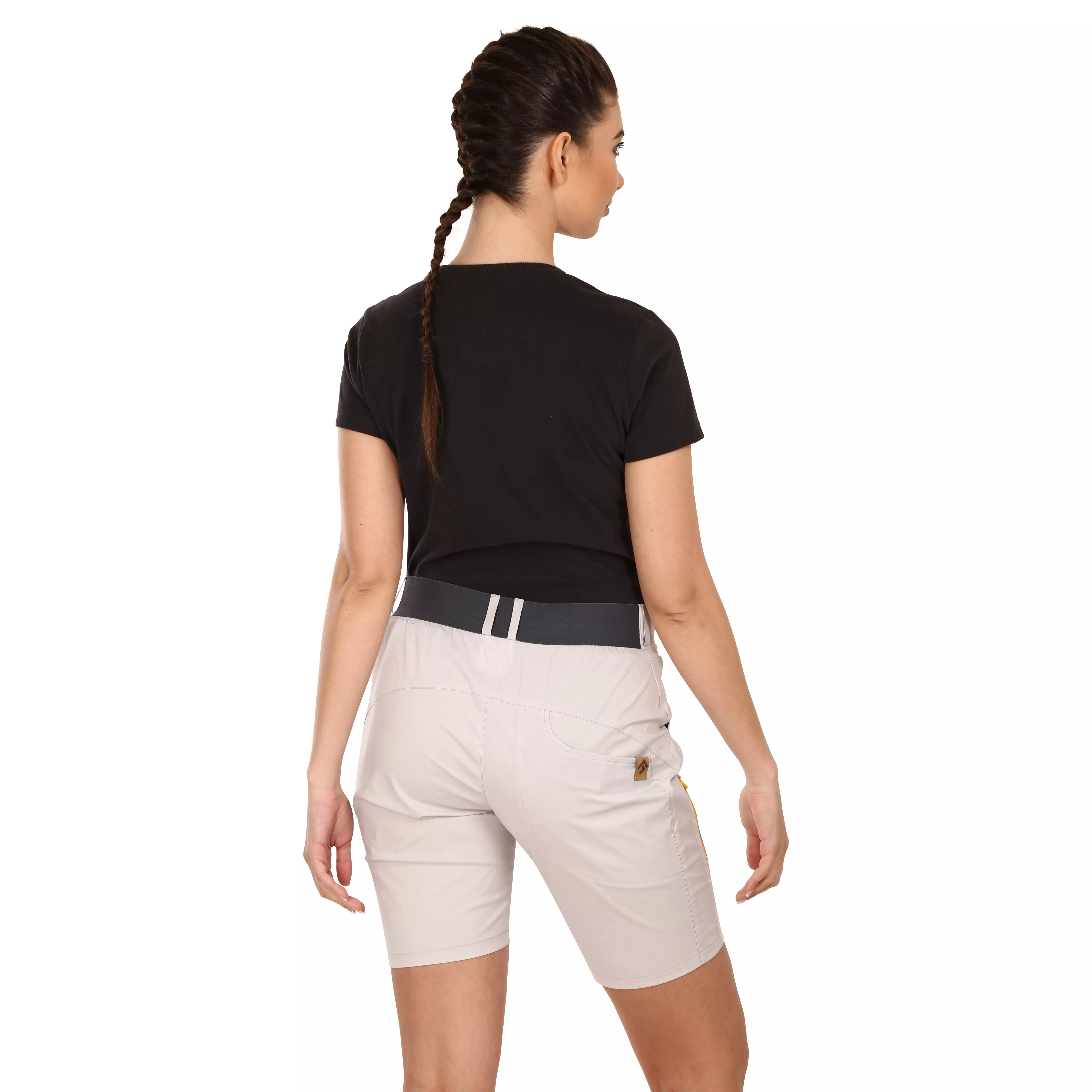 The waistband is engineered with an elastic back insert, allowing the shorts to adapt to your body without feeling tight. Belt loops are included so you can add a belt if desired. Multiple pockets are carefully placed — two pleated front pockets, one pleated back pocket, and a zippered thigh pocket for secure storage of small items. Reflective details improve visibility in low-light conditions.