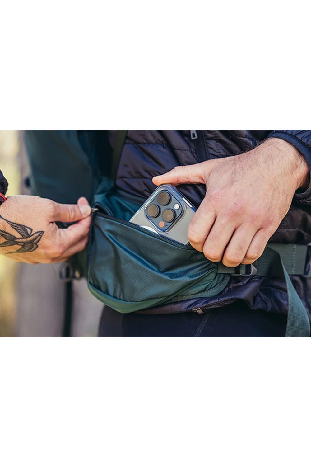 On-the-Go джоб на презрамката, предназначен за бърз достъп до Garmin inReach®, лека закуска или очила