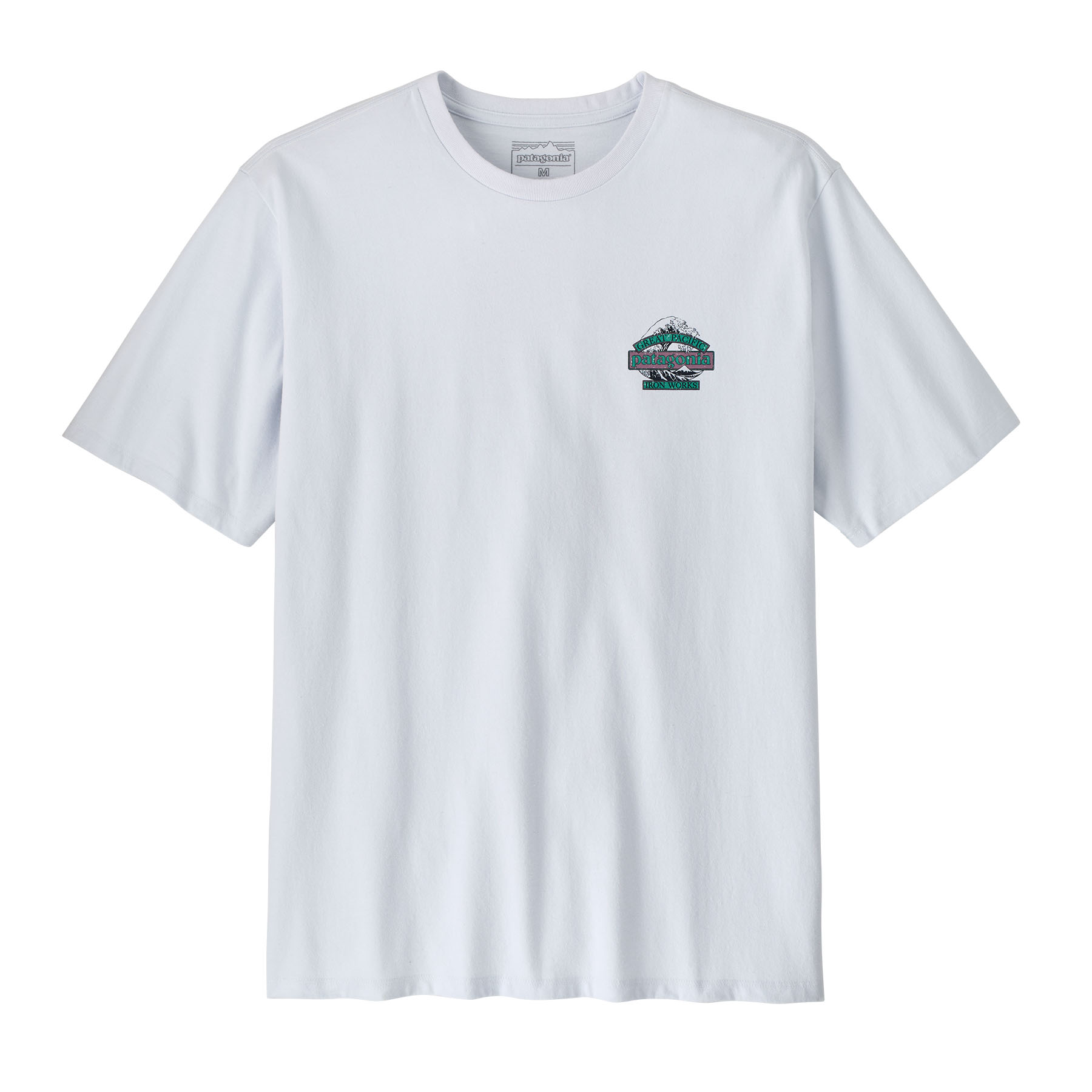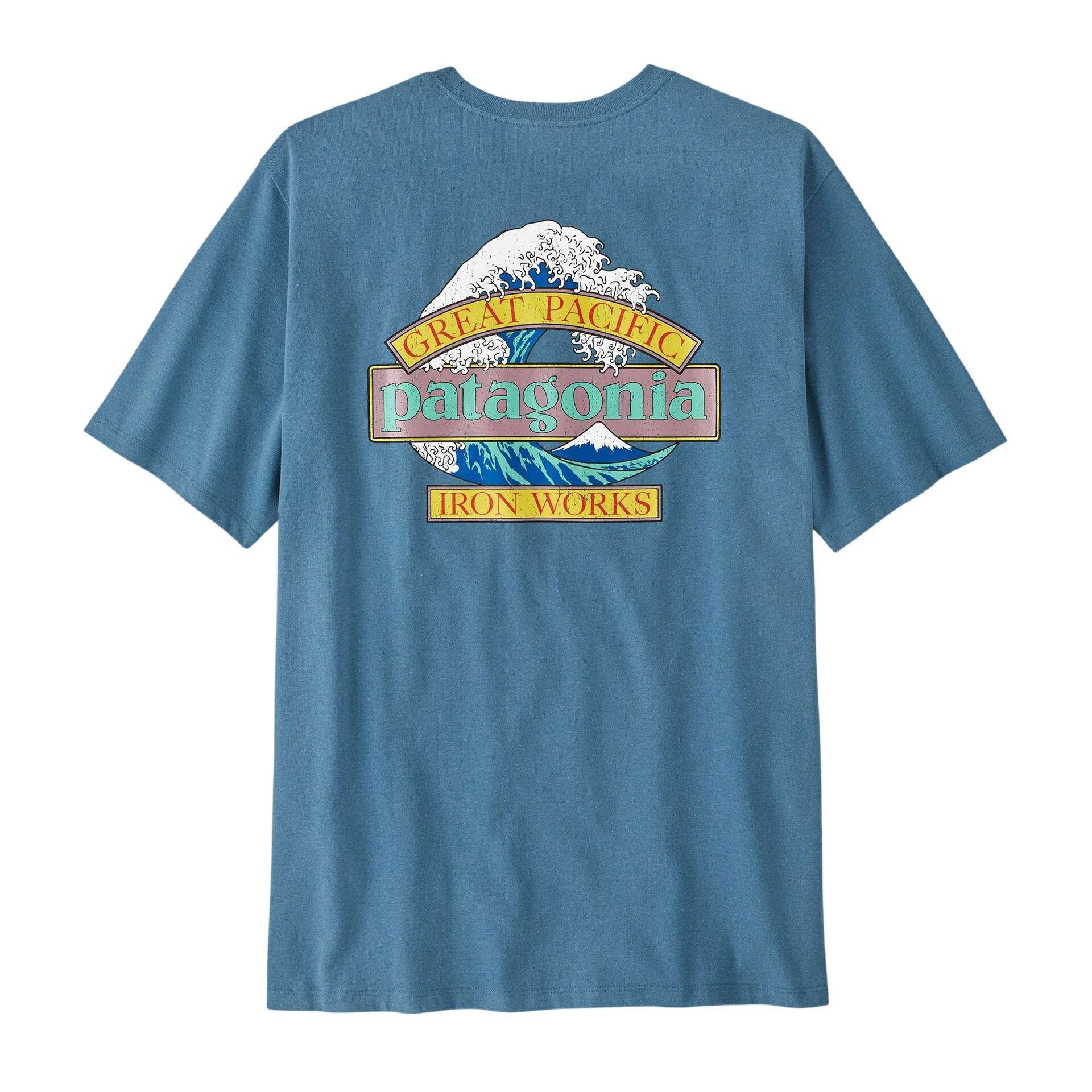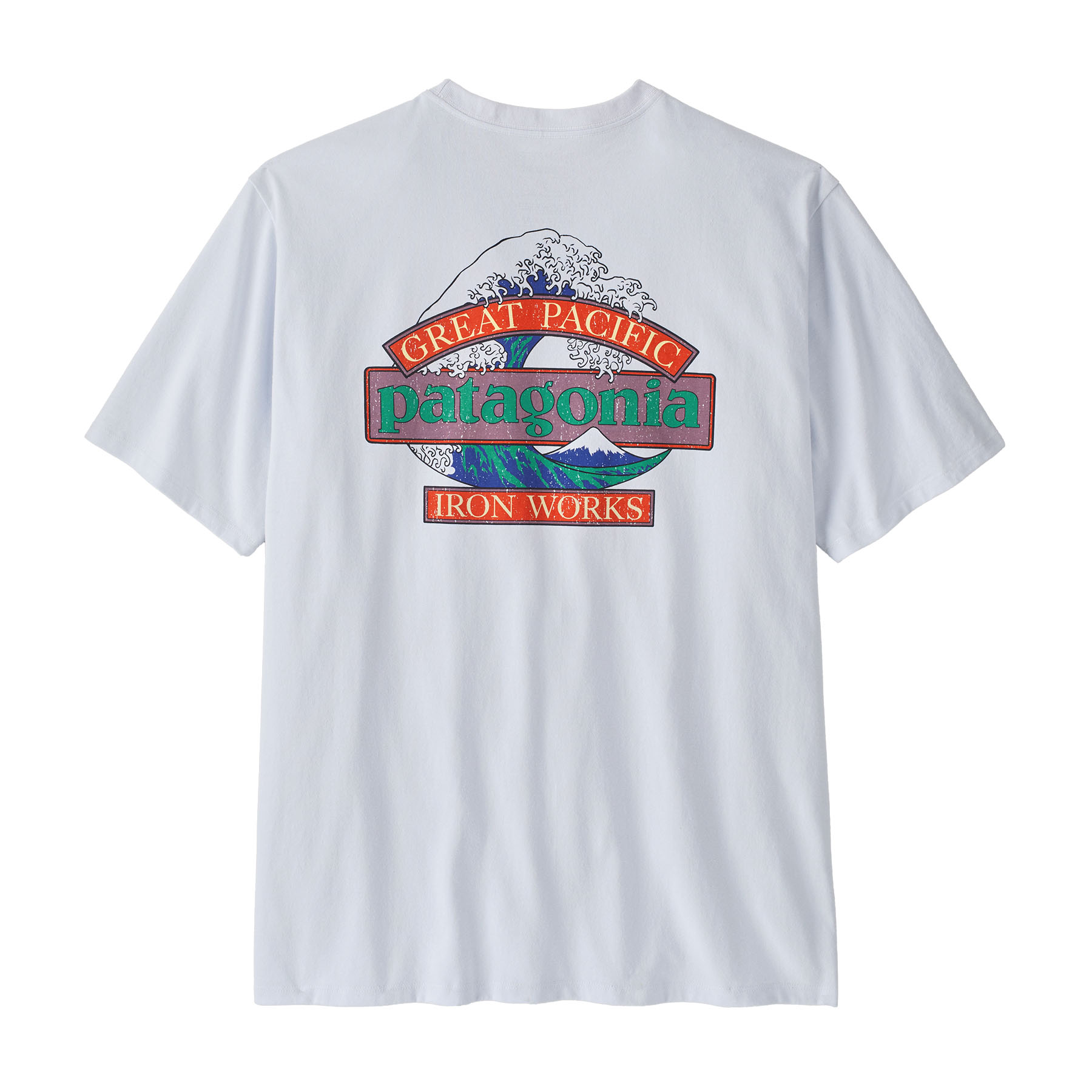 - The Patagonia Men’s Great Waves Responsibili-Tee is a classic crewneck T-shirt designed for everyday wear. It features a regular fit that offers a balanced silhouette, suitable for both standalone use and layering. The “Great Waves” graphic combines Patagonia’s wordmark with the iconic wave artwork inspired by Hokusai, reflecting coastal heritage and brand identity.