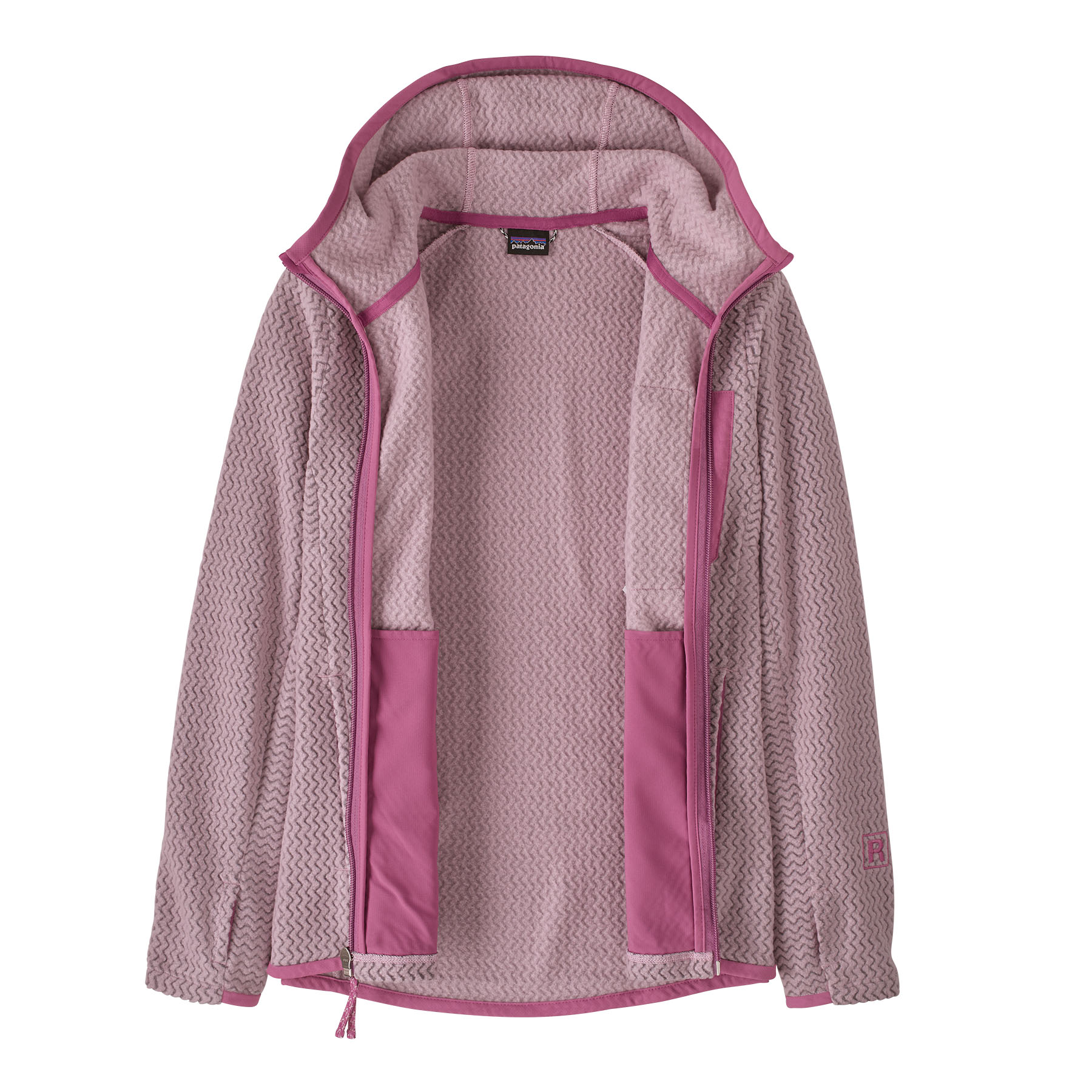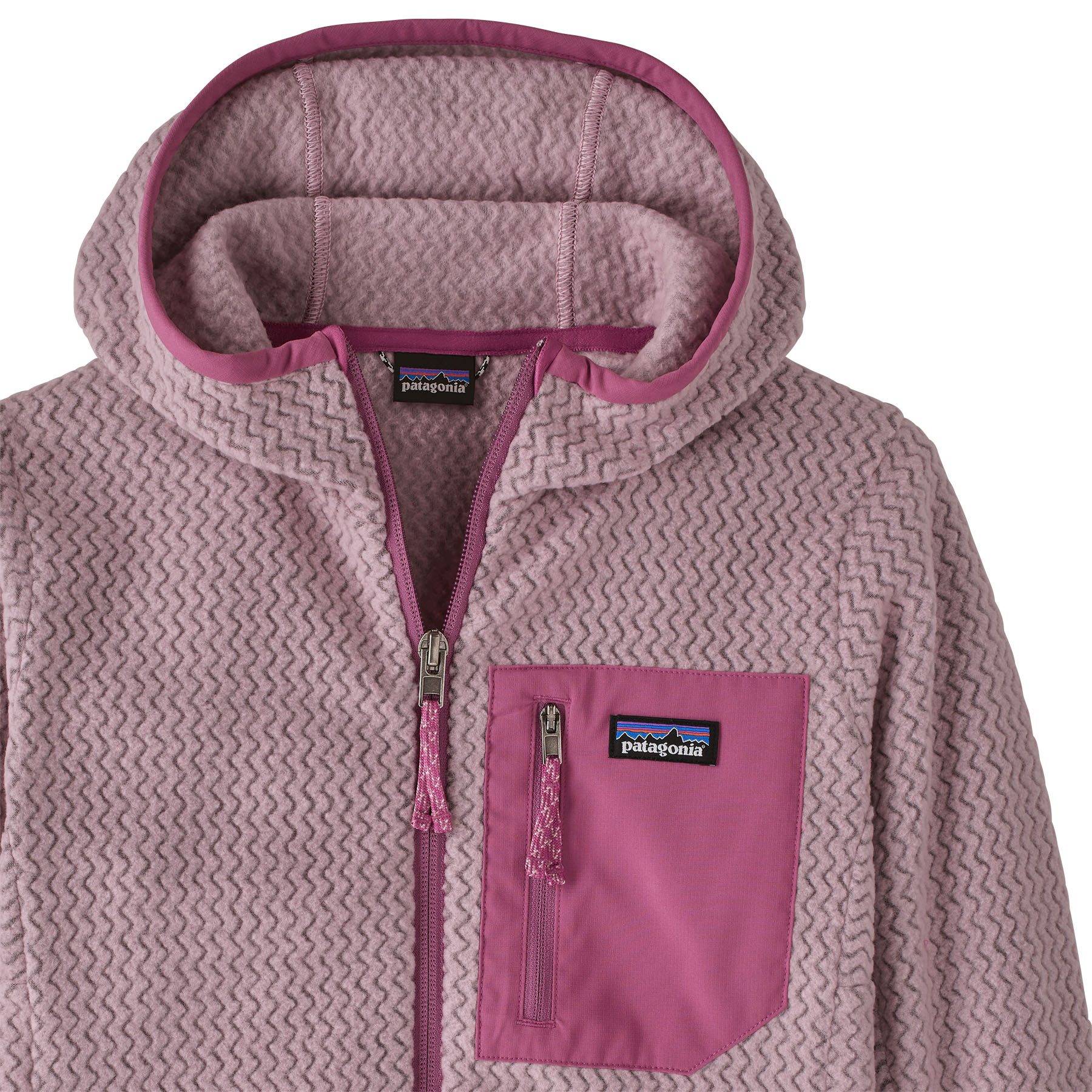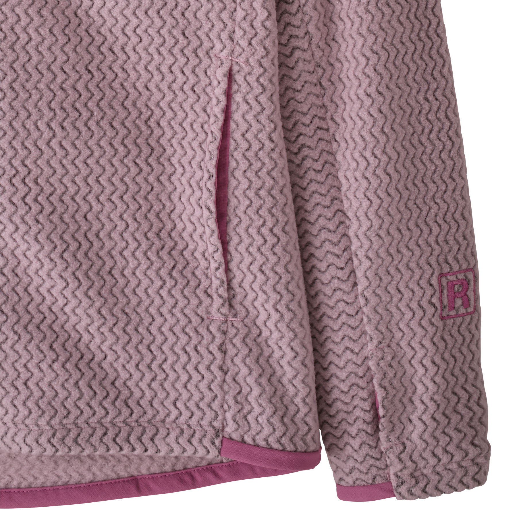 100% recycled polyester jacquard fleece with hollow-core yarns features a unique zigzag texture that wicks moisture, dries fast and is highly breathable for high-output activities